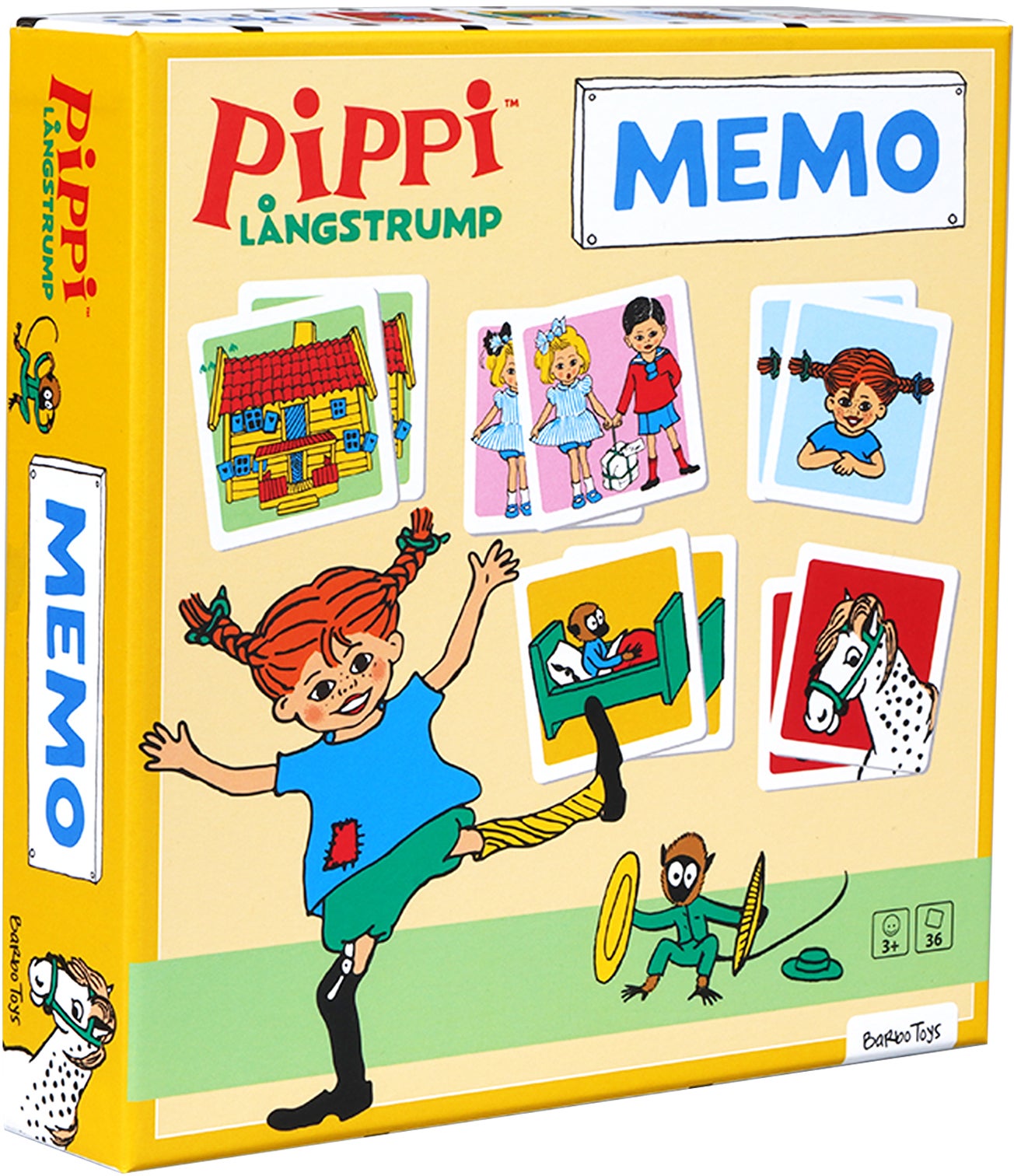 Huskespil fra BarboToys med 36 kort med sjove billeder. Perfekt til sjov indlæring. - Motiv fra Pippi Langstrømpe. - Træner koncentration og hukommelse. - Antal dele: 36. - CE-mærket. - Anbefalet alder: Fra 3 år.