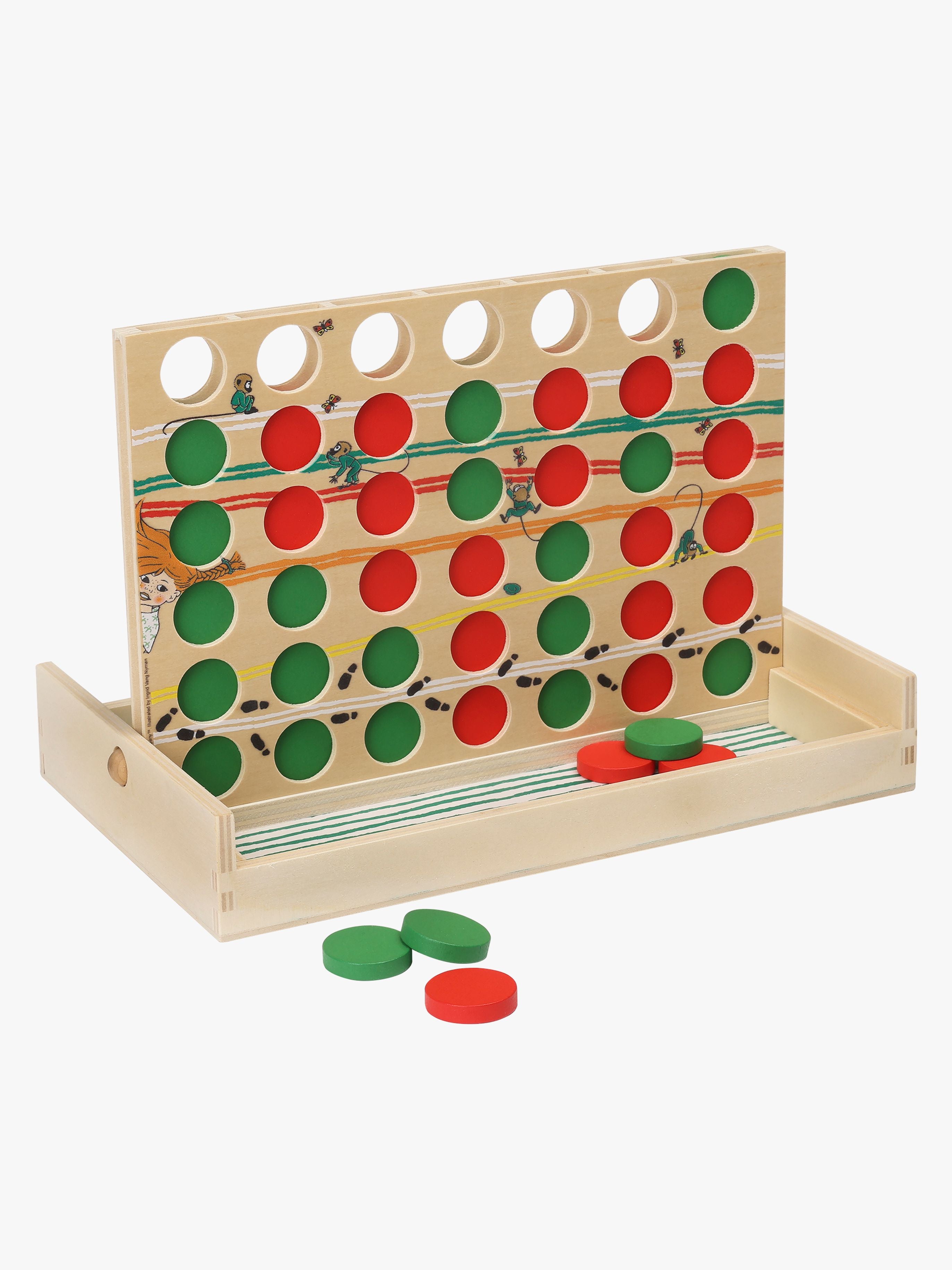 Dette Pippi Langstrømpe produkt bringer glæde til både børn og voksne med sit farverige og inspirerende tema. Spillet handler om at få 4 på stribe med din egen farve, samtidig med at du skal forhindre din modstander i at gøre det samme. Det er ideelt til mange sjove spiløjeblikke i familien.