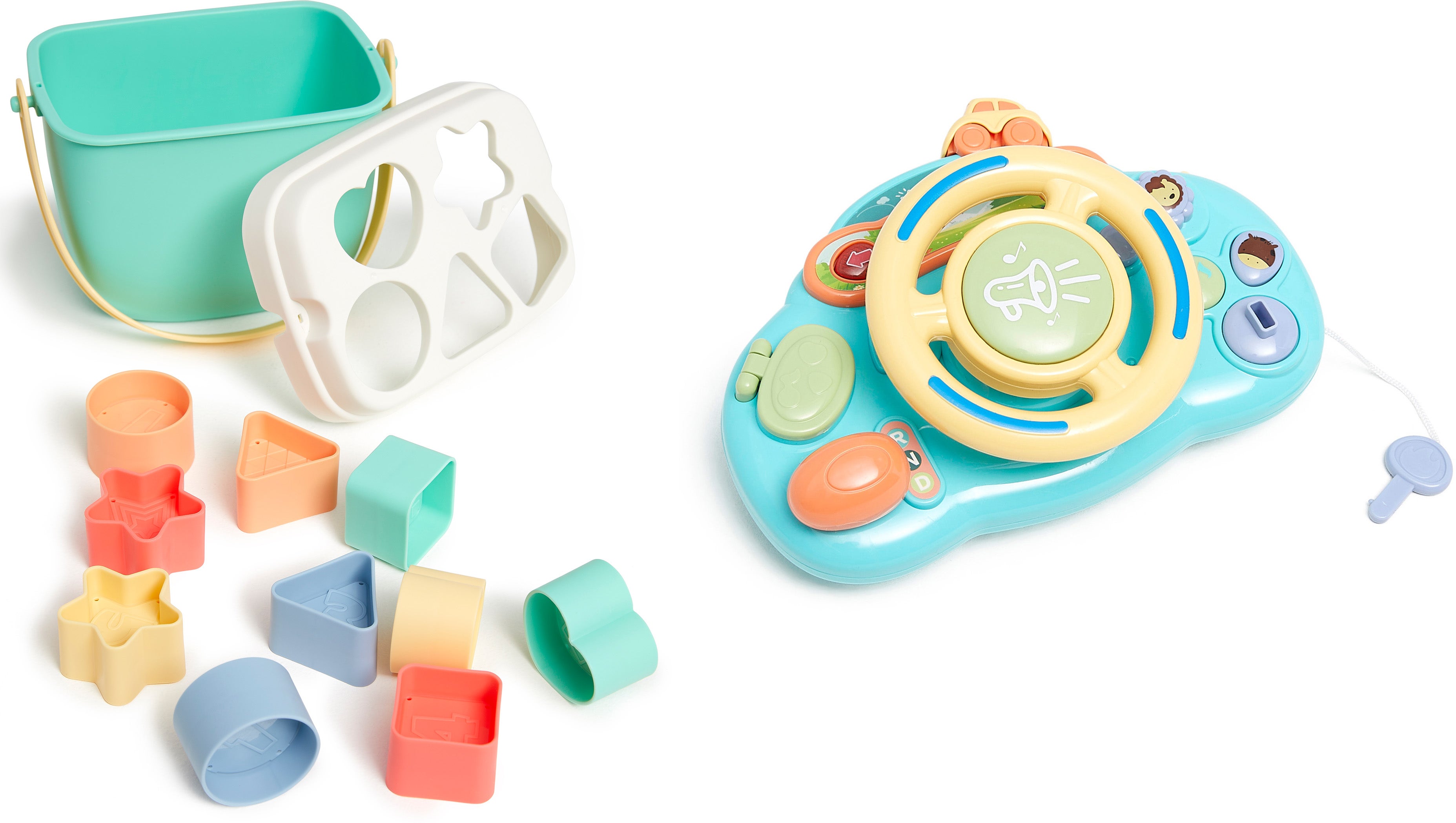 Lærerig pakke fra Cloudberry Castle med et indbydende design. Den har et sjovt instrumentbræt med rat og lys- og lydeffekter og en puttekasse med 12 forskelligt formede klodser. Perfekt til at træne dit barns hånd-øje koordination og finmotorik. - CE mærket. - Anbefalet alder: Fra 12 mdr. - Plastik.