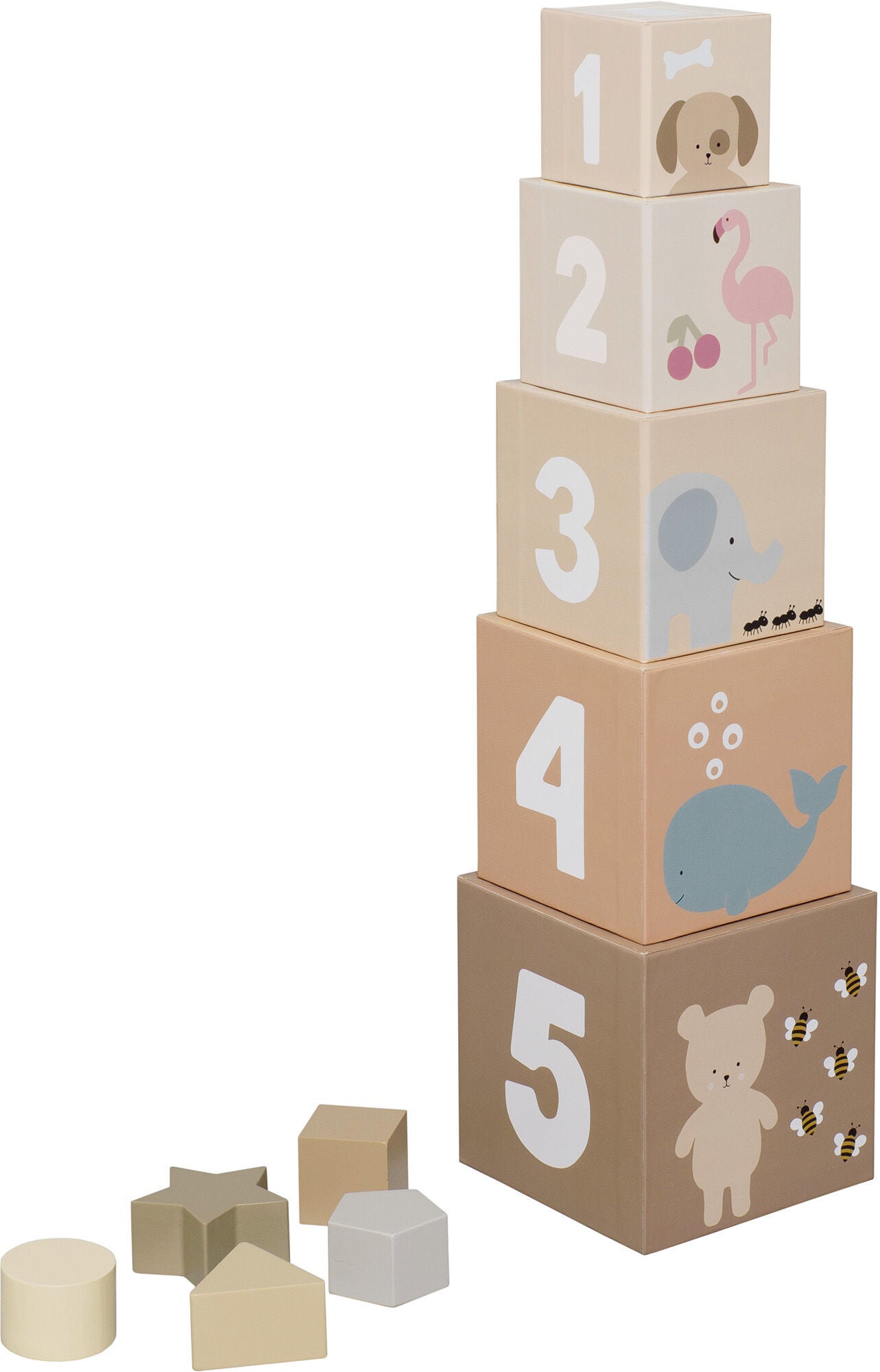 Fem stabelbare klodser fra JaBaDaBaDo i træ med et underholdende design. De har et forskelligt motiv og er nummererede med tallene 1-5. Klodserne kan også bruges som puttekasser, da de har formede huller, så man kan putte den ret form i ret klods. Perfekte til træning af dit barns hånd-øje-koordination og finmotorik. CE-mærket. 5 stabelbare klodser med søde dyremotiver. Nummererede 1-5. Anbefalet alder: Fra 1,5 år.