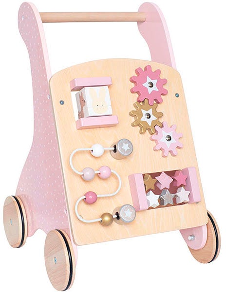 Sød Bunny aktivitetsklapvogn fra JaBaDaBaDo i træ med mange, sjove legetøj. Den har letrullende hjul med gummierede kanter og et opbevaringsrum på bagsiden. Dette legetøj fremmer udviklingen af finmotorik, koordination og problemløsning. CE-mærket Anbefalet alder: Fra 1.5 år
