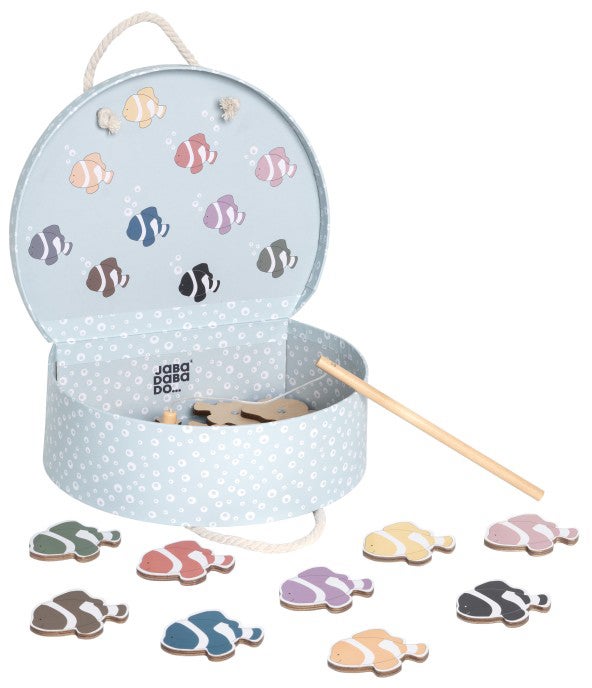 Sjovt fiskespil fra Jabadabado. Perfekt til mange timers sjov. - Indeholder: 10 fisk, 2 fiskestænger, 1 taske. - Den, der har fanget flest fisk, når dammen er tom, vinder! - Dæmpede farver. - En praktisk opbevaringstaske med håndtag medfølger. - Let at tage med på farten. - CE-mærket. - Anbefalet alder: Fra 3 år. - Træ.