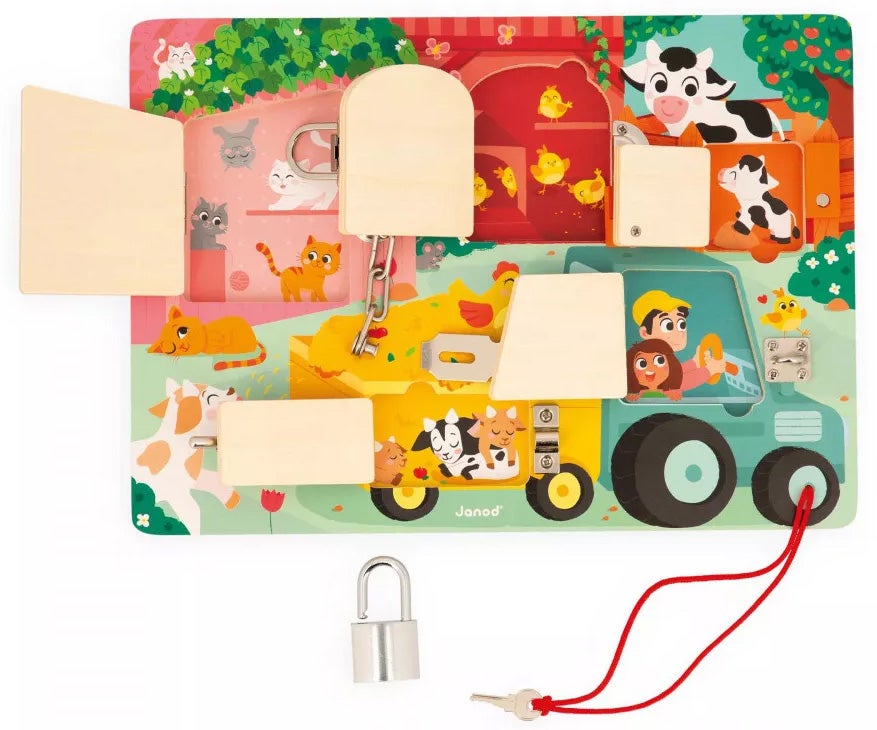 Låsebræt fra Janod med et inspirerende bondegårdstema. Perfekt til træning af dit barns finmotorik. - Fem døre med fem forskellige låsesystemer. - Nøgle, haspe, dørkæde, spænde og lås. - Bondegårdstema. - Sødt og sjovt design. - Perfekt til træning af dit barns finmotorik! - CE-mærket. - Anbefalet alder: Fra 3 år. - FSC-certificeret krydsfiner, metal.