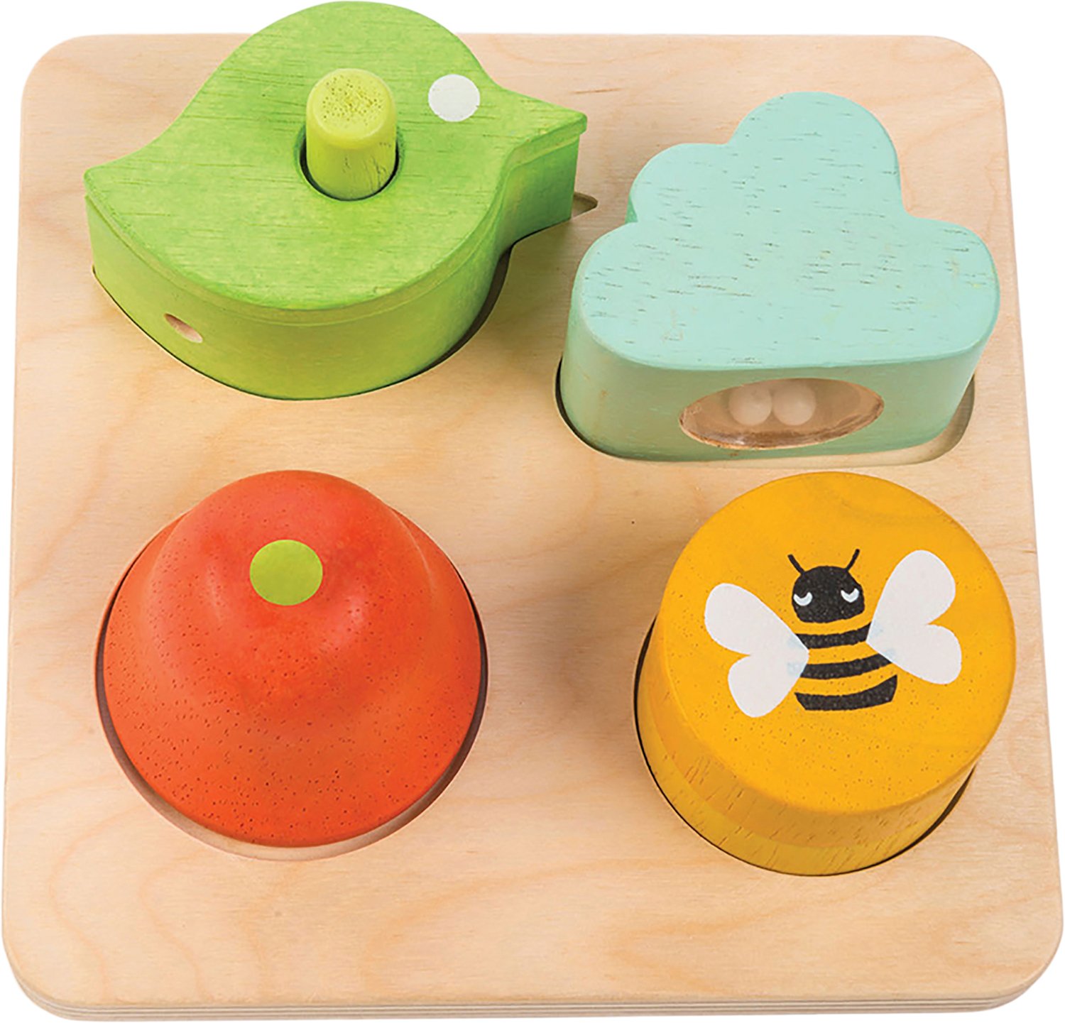 Med fire farverige brikker, der hver repræsenterer forskellige dyremotiver, vil børnene blive draget ind i en verden af leg og læring. Hver gang en brik placeres korrekt, aktiveres en lyd, der tilføjer en ekstra dimension til legestunden og opmuntrer til interaktion og udforskning.