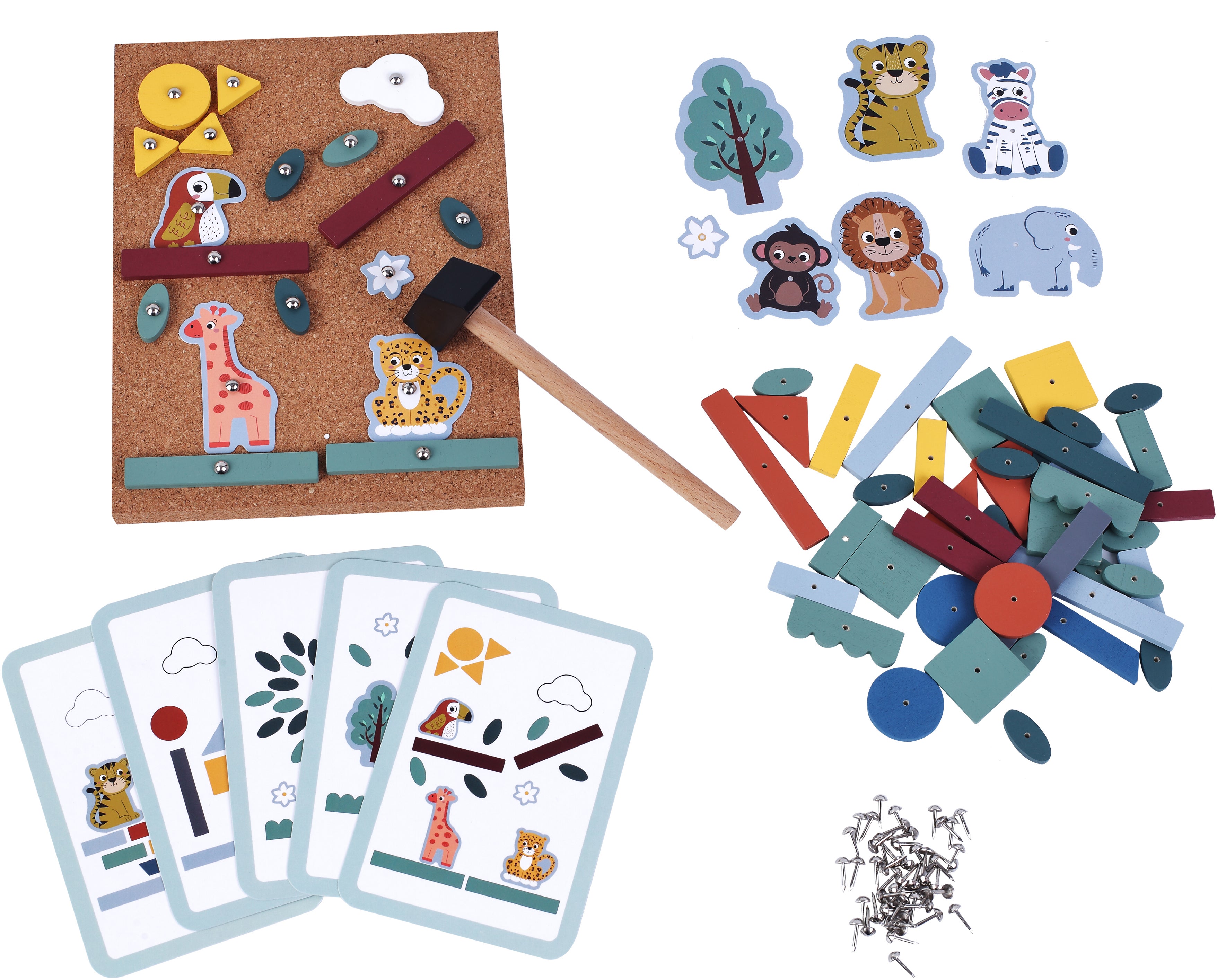 Et underholdende spil fra Kinder and Kids med et en masse spændende tilbehør. Perfekt legetøj til din lille entreprenør! - Sæt med hammer, søm og korktavle. - Indeholder: 57 brikker i træ, 11 dyr i karton. - Sæt jungledelene fast på korktavlen ved hjælp af sømmene. - Udvikler finmotorik og form- og farvegenkendelse. - CE-mærket. - Anbefalet alder: Fra 3 år. - Krydsfiner, birk, karton, jern, rustfrit stål.