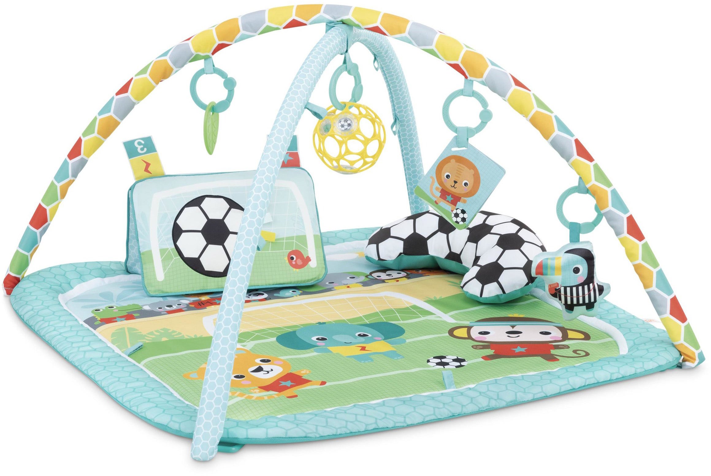 Grip & Kick aktivitetscenter fra Bright Starts med et fodboldtema. Det har sjovt hængelegetøj , der stimulerer barnets syns- og følesans og en aftagelig legetøjsbøjle , så den også kan bruges som legetæppe. Perfekt til stimulering af barnets udvikling. - 5 stk. hængelegetøj medfølger. - Perfekt sted for dit barn at øve sig i at ligge på maven og rulle rundt. - Sjove farver og et spejl til visuel stimulering. - Der medfølger en pude, der er god til leg, når dit barn ligger på maven. - Spiller rolige og dejlige melodier. - Bidering. - Bløde plysdyr. - Anbefalet alder: Fra nyfødt. - Batteri: 3xAA (medfølger ikke).