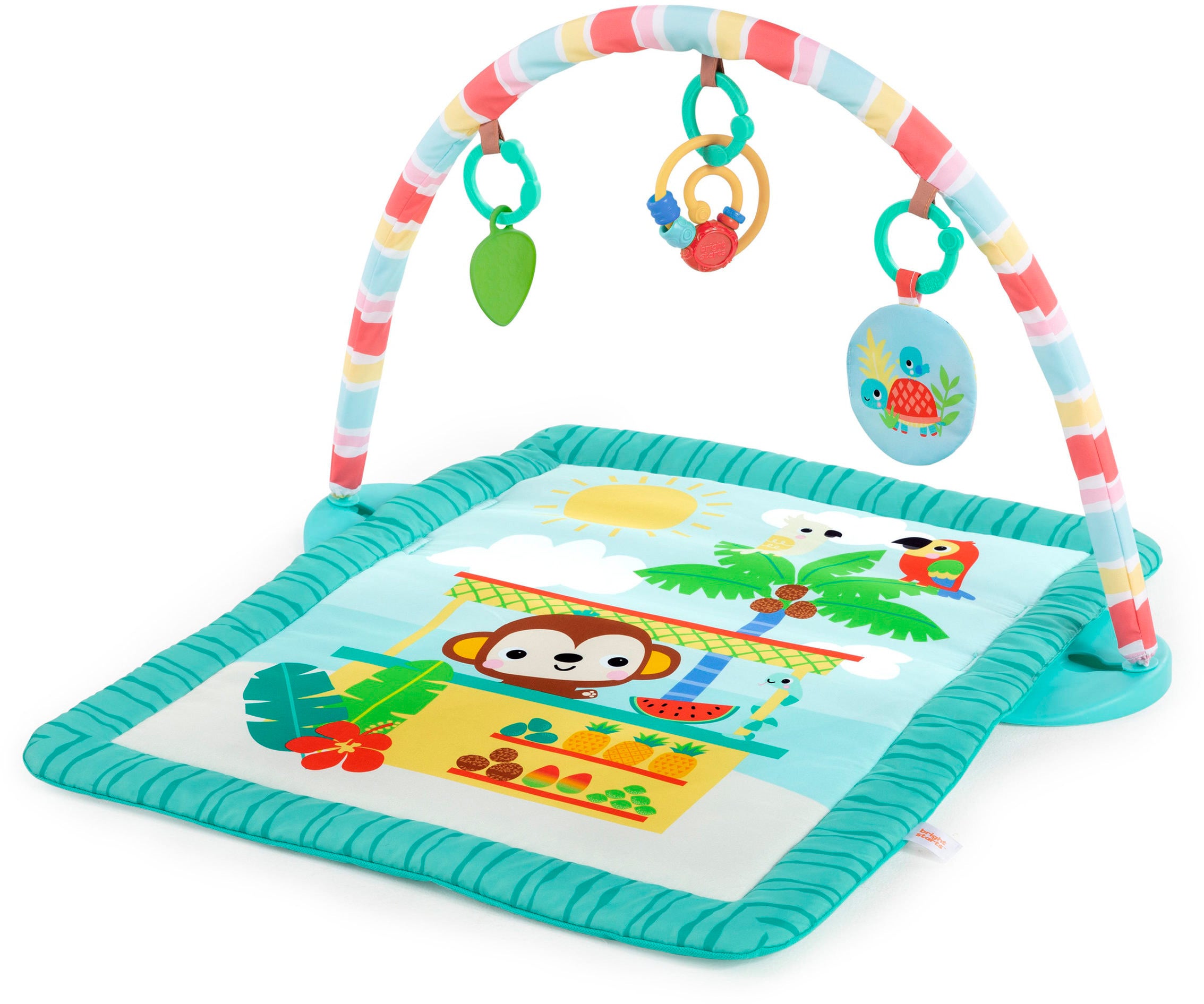 Tiki Toy Bar aktivitetscenter fra Bright Starts med sjovt hængelegetøj der stimulerer barnets syns- og følesans. Det har en aftagelig legetøjsbøjle, så den også kan bruges som legetæppe. Perfekt til stimulering af barnets udvikling. - Indeholder 3 hængende stykker legetøj. - Perfekt sted for dit barn at øve sig i at ligge på maven og rulle rundt. - Raslende lyd. - Sjove farver. - Let at sammenfolde og opbevare. - Anbefalet alder: Fra nyfødt.