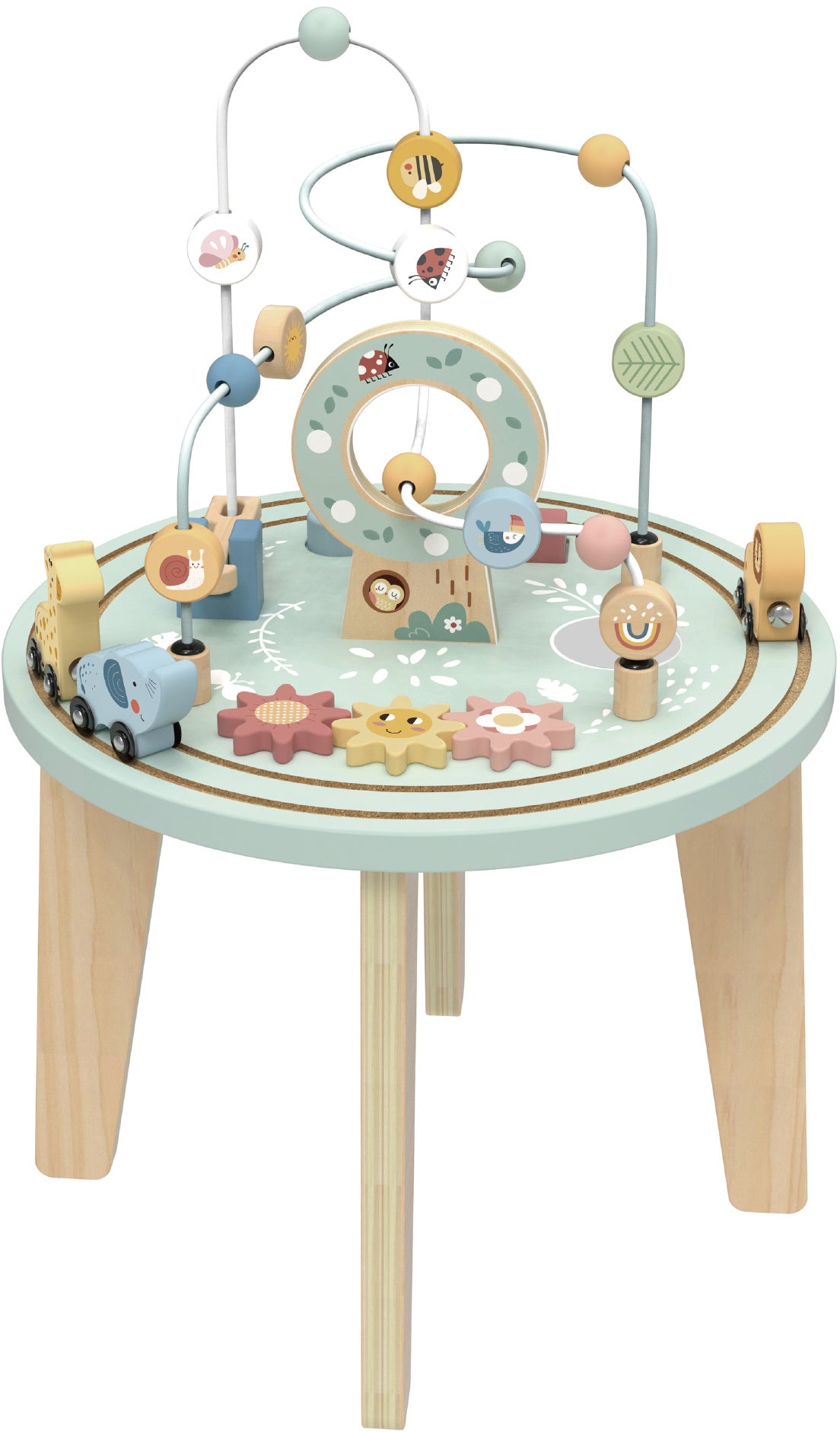 Aktivitetsbordet indeholder forskellige aktiviteter såsom klodsespil, drejeskiver og lydfunktioner, der hjælper med at udvikle dit barns hånd-øje-koordination og problemløsningsevner. Hver del er lavet af høj kvalitet træmaterialer, hvilket sikrer langvarig holdbarhed og sikker leg.