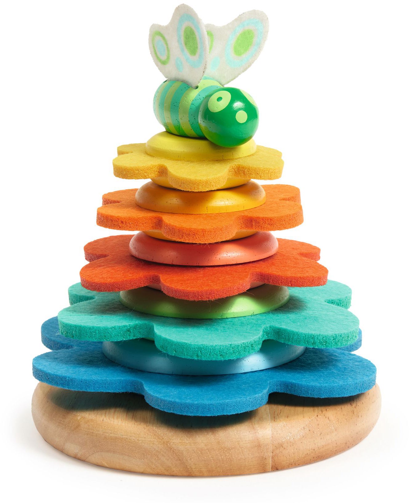 Stabeltårn fra Djeco med 6 forskelligformede klodser. Perfekt til mange timers sjov. - Indeholder: 5 ringe, 1 baseplade, 1 pind, 1 sommerfugl. - Byg tårnet på nye måder og med nye former hver gang. - Stimulerer og udvikler barnets logik, finmotorik og hånd-øje-koordination. - Let for små hænder at gribe om. - Forskellige teksturer hjælper til med udviklingen af dit barns følesans. - Rengøres på overfladen med en fugtig klud. - CE-mærket. - Anbefalet alder: Fra 1,5 år. - Træ, polyester.