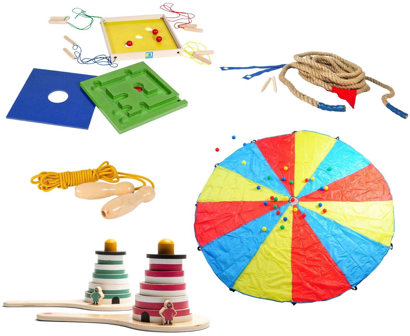 • Fem forskellige legeelementer, der fremmer teamwork og samarbejde.