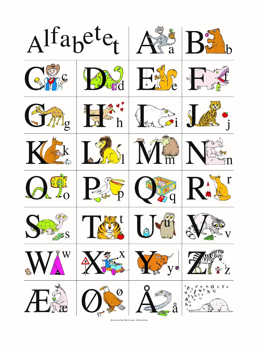 Børn lærer på mange forskellige måder. En meget brugbar metode, når det gælder indlæring af faktuelle ting såsom alfabetet, er simpelthen at se på det ofte. Igen og igen. Denne plakat er i et format 30 x 40cm, som kan hænge et sted, hvor dit barn ofte er. Måske blikket lige vandrer indimellem og falder på plakaten med dyr, der starter med det bogstav, dyret står ved - og mange andre små, finurlige detaljer, som vil bidrage til, at ny viden lagres lidt efter lidt.