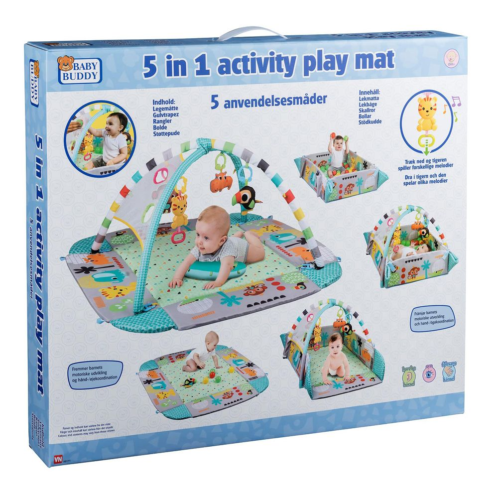Den 5 i1 aktivitets legemåtte tilbyder fem forskellige legefunktioner, der gør den ideel til børn i alle aldre. Den kan bruges til at skabe en hyggelig legeplads derhjemme, til at lære om former og farver, eller som et sikkert underlag til at øve sig på at kravle og gå. Hver sektion af måtten er fyldt med spændende mønstre og teksturer, der engagerer barnets sanser.