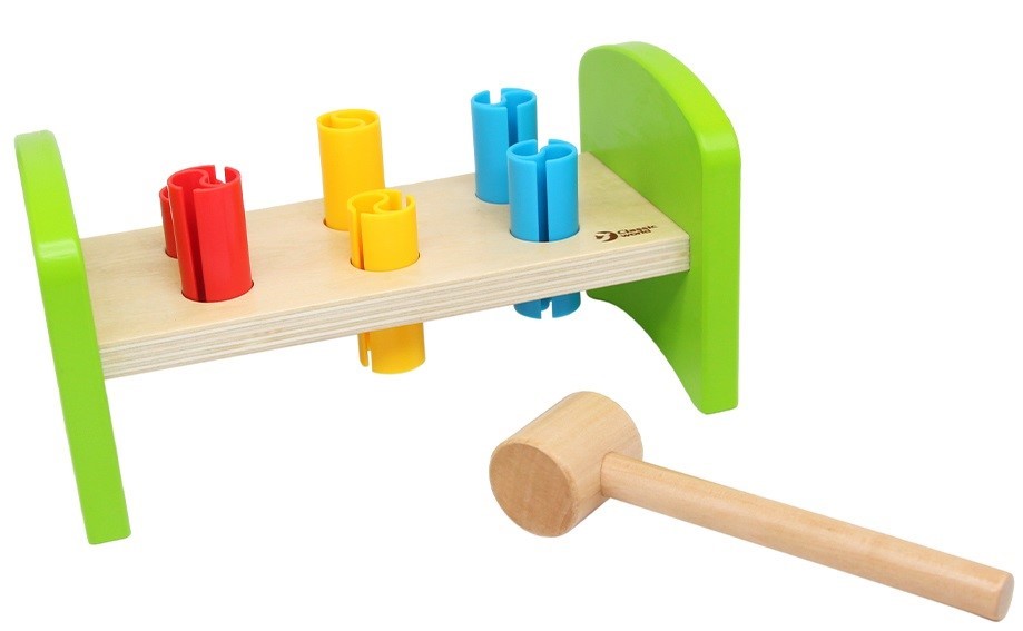 Farverig hammerbænk med 6 pinde og en hummer, der vil udvikle dit barns hånd-øje-koordination og armstyrke. Den svinger fra side til side, når den vender på hovedet, hvilket gør spillet mere udfordrende og sjovt. Alder: fra 12 måneder. Størrelse: 20 x 10
