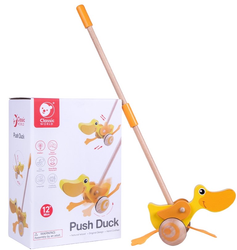 Se dit barn smile og grine, mens han skubber til anden, og dens vinger slår. Alder: fra 12 måneder. Størrelse: 38 x 47 x 11 cm Materialer: Træ Classic World har produceret kvalitets legetøj siden 1998, og har igennem årene vundet flere priser for deres pr