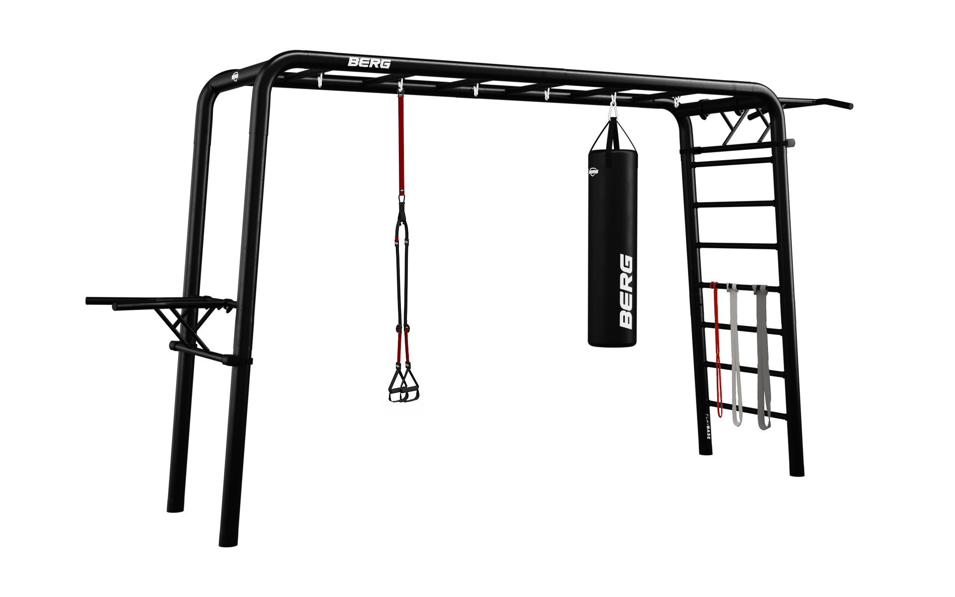 BERG PlayBase Large + Sports Set er en multifunktionel trænings- og aktivitetsstation til haven. Med det inkluderede Sports Set får du adgang til en bred vifte af sports- og fitnessmuligheder i ét og samme system. Den solide stålkonstruktion er bygget til at klare intensiv brug – både til leg, sport og udendørs træning.