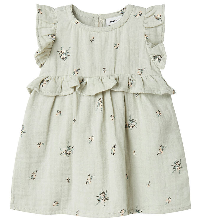 Name It Kjole - Musselin - NbfHikka - Aqua Gray m. Blomster