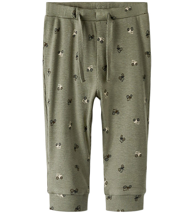 Disse Name It bukser i ribmateriale er den perfekte kombination af komfort og stil til dit barn. Med en flot dusty olive farve og et unikt print er de ideelle til både hverdag og fest.