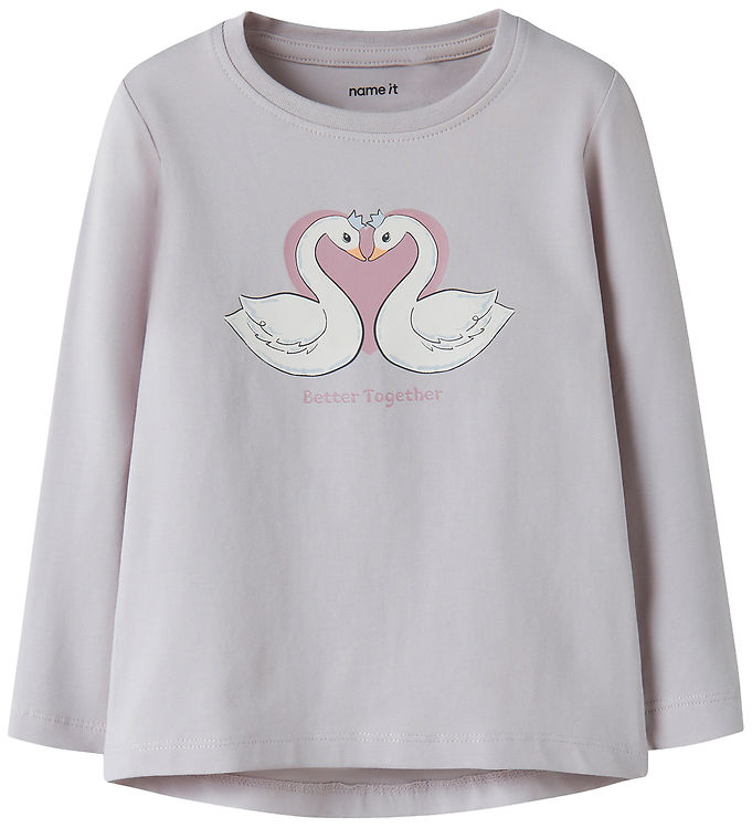 Forkæl dit barn med den fantastiske Name It Bluse - NmfVix i en smuk lilac marmor farve med et charmerende svanehjerte-design. Denne bluse kombinerer stil og komfort på en perfekt måde, hvilket gør den til et ideelt valg til både hverdagens lege og festlige lejligheder.