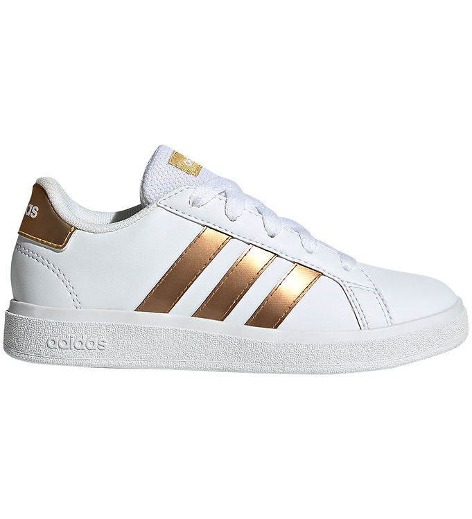 Tag din stil og komfort til nye højder med adidas Performance Sko - Grand Court 2.0 K i en elegant hvid og guld farvekombination. Disse sko er designet til børn, der ønsker at kombinere sport med hverdagens aktiviteter. Med deres tidløse design og kvalitetsmaterialer, er de perfekte til både skolen og fritiden.