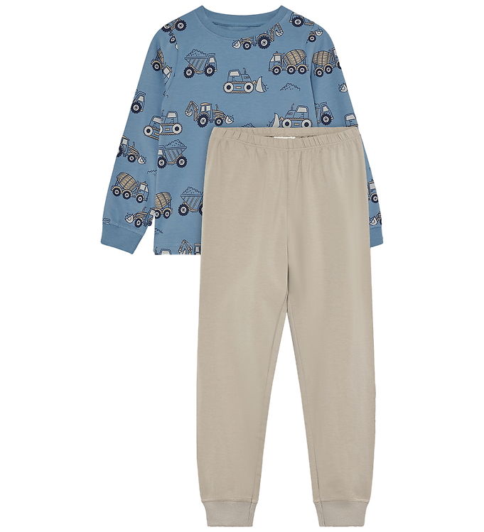 Det 2-delte sæt består af en blød t-shirt og et par behagelige bukser, der sikrer, at dit barn kan bevæge sig frit om natten. T-shirten har et fint design med en dejlig blå nuance, der giver en rolig atmosfære, mens bukserne er elastiske i taljen for optimal pasform.