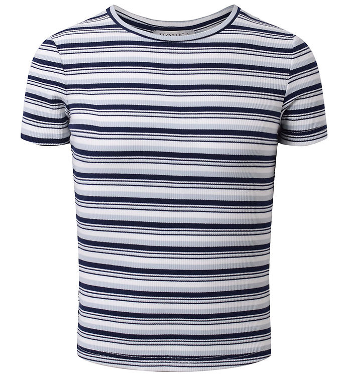 Den bløde ribkvalitet sikrer, at t-shirten føles behagelig mod huden, samtidig med at den giver en fantastisk pasform. De blå striber giver et friskt og trendy udtryk, der er let at style med både jeans, shorts og nederdele.