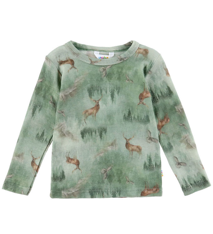 Denne Joha bluse er den perfekte kombination af komfort og stil. Fremstillet i blød uld, tilbyder den optimal varme og åndbarhed, hvilket gør den ideel til både leg og afslapning. Med det smukke grønne design og skovmotiv vil dit barn elske at have denne bluse på.
