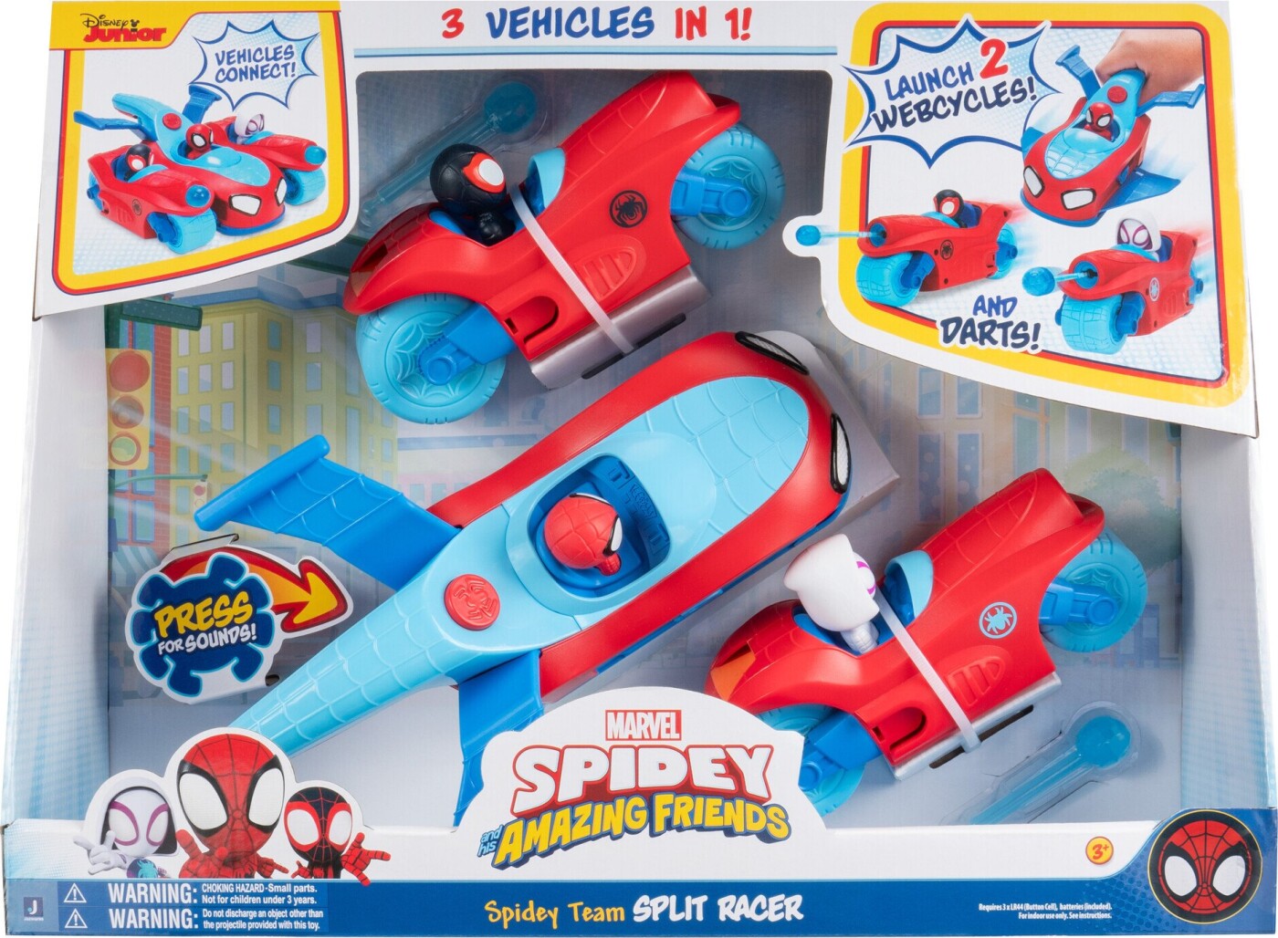 Del og kør med MARVEL Spidey and His Amazing Friends Spidey Team Split Racer. Denne 22 cm lange team racer inkluderer Spidey, Spin og Ghost-Spider, som deler sig op i tre separate køretøjer. Først...