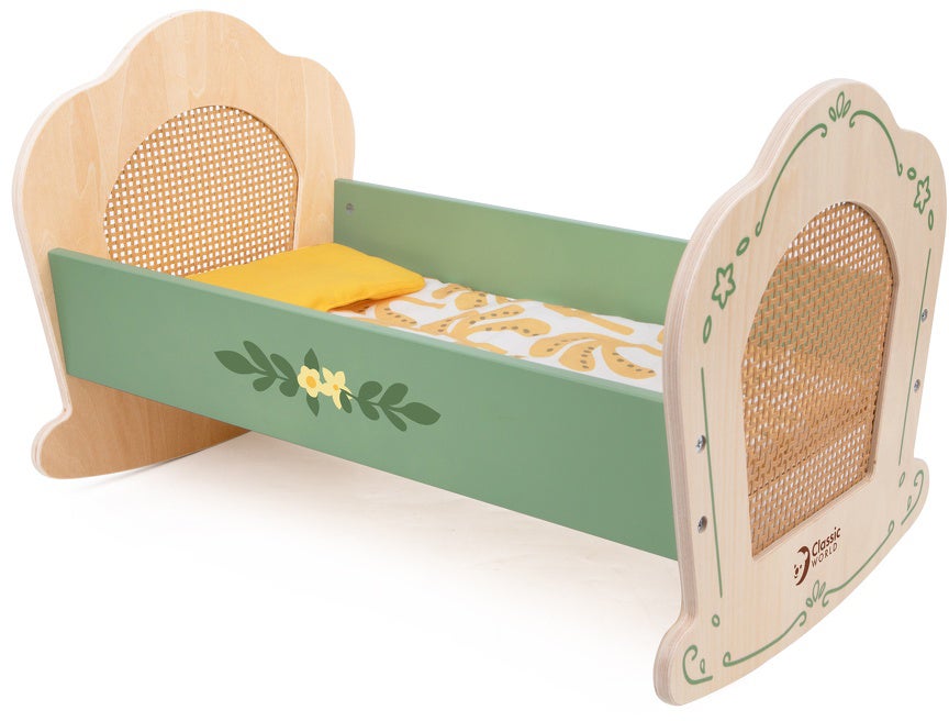 Sød dukkevugge fra Classic World med et hyggeligt sengesæt. Perfekt til sjov leg. - Indeholder: 1 seng, 1 pude, 1 lagen. - Perfekt til sjov rolleleg. - Afrundede kanter. - Slidstærkt materiale. - Sødt design. - Maskinvask 30°C. - CE-mærket. - Anbefalet alder: Fra 3 år. - Træ.