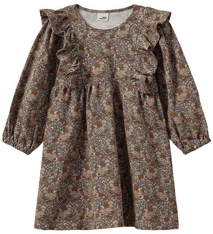 Forkæl dig selv med den smukke Sofie Schnoor Kjole - LulsSB i en elegant brun farve med et delikat blomsterprint. Denne kjole er designet til at fremhæve din feminine stil, uanset om det er til hverdag eller fest.