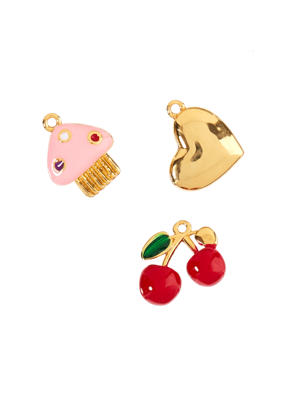 me&my BOX Guldbelagt Vedhæng - Hjerte Cupcake Kirsebær De fineste 18 karat guldbelagte vedhæng. De 3 vedhæng er til at sætte på halskæder, øreringe eller ankelkæder. Indhold: 1 x hjerte, 1 x cupcake, 1 x kirsebær Materiale: 18K forgyldt messing, nikke