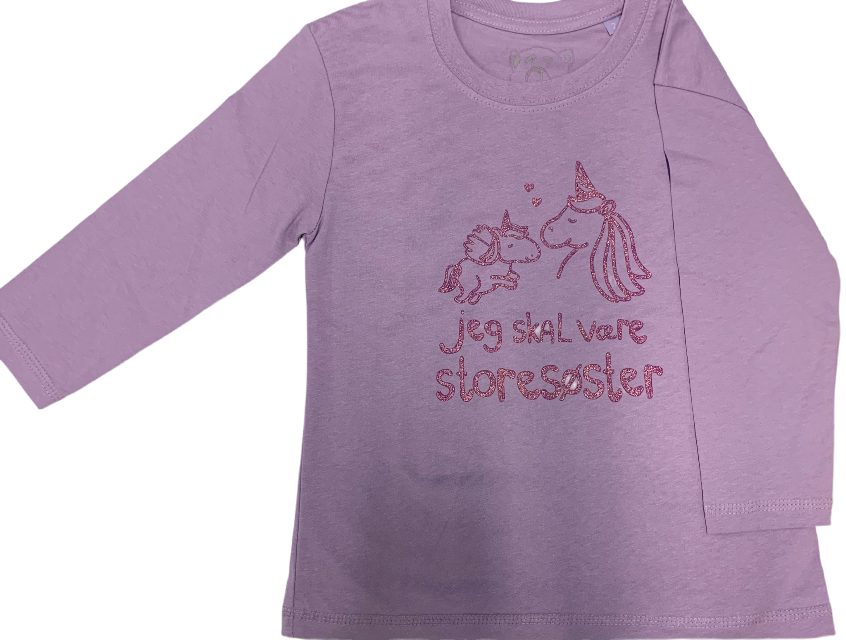 Storesøster T-Shirt L/S Enkel og lækker storesøster bluse med det fineste tryk i Lilla Krystalina, med en stor enhjørning som symboliserer storesøster, og en lille som symboliserer den kommende lillebror eller lillesøster. Vi har i en længere periode haft