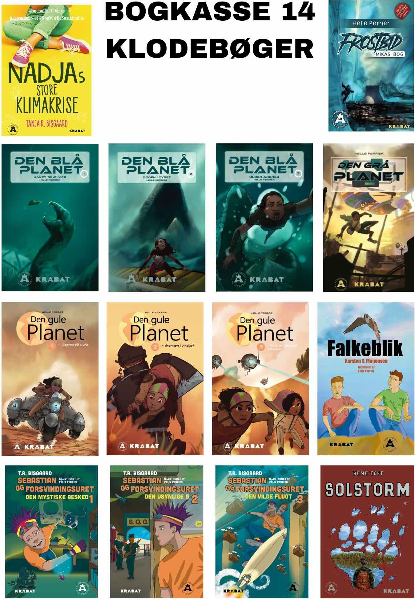 Bogkasse med 14 Klodebøger. Bogkasse med forlaget KRABAT's 14 Klodebøger. Bogkassen...