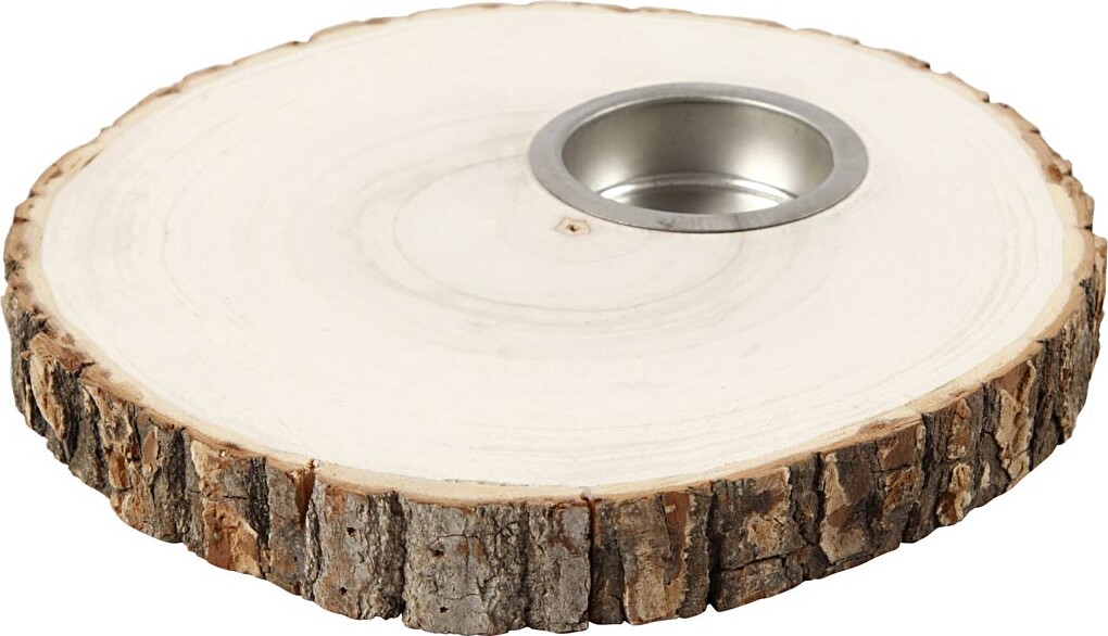 Denne smukke fyrfadsstage er lavet af en træskive med bark, og den er monteret med en metalindsats...