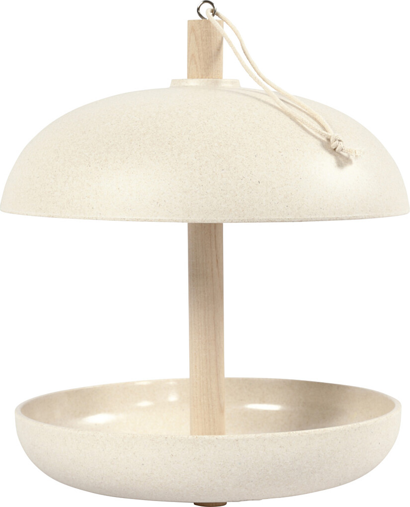 To-delt fuglefoderhus af bambusfibre med gennemgående stang i bambustræ samt snor til ophæng....