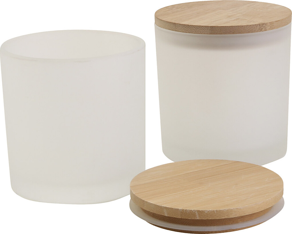 Dekorative, praktiske krukker i frostet glas med tilhørende trælåg med gummikant. Kan anvendes...