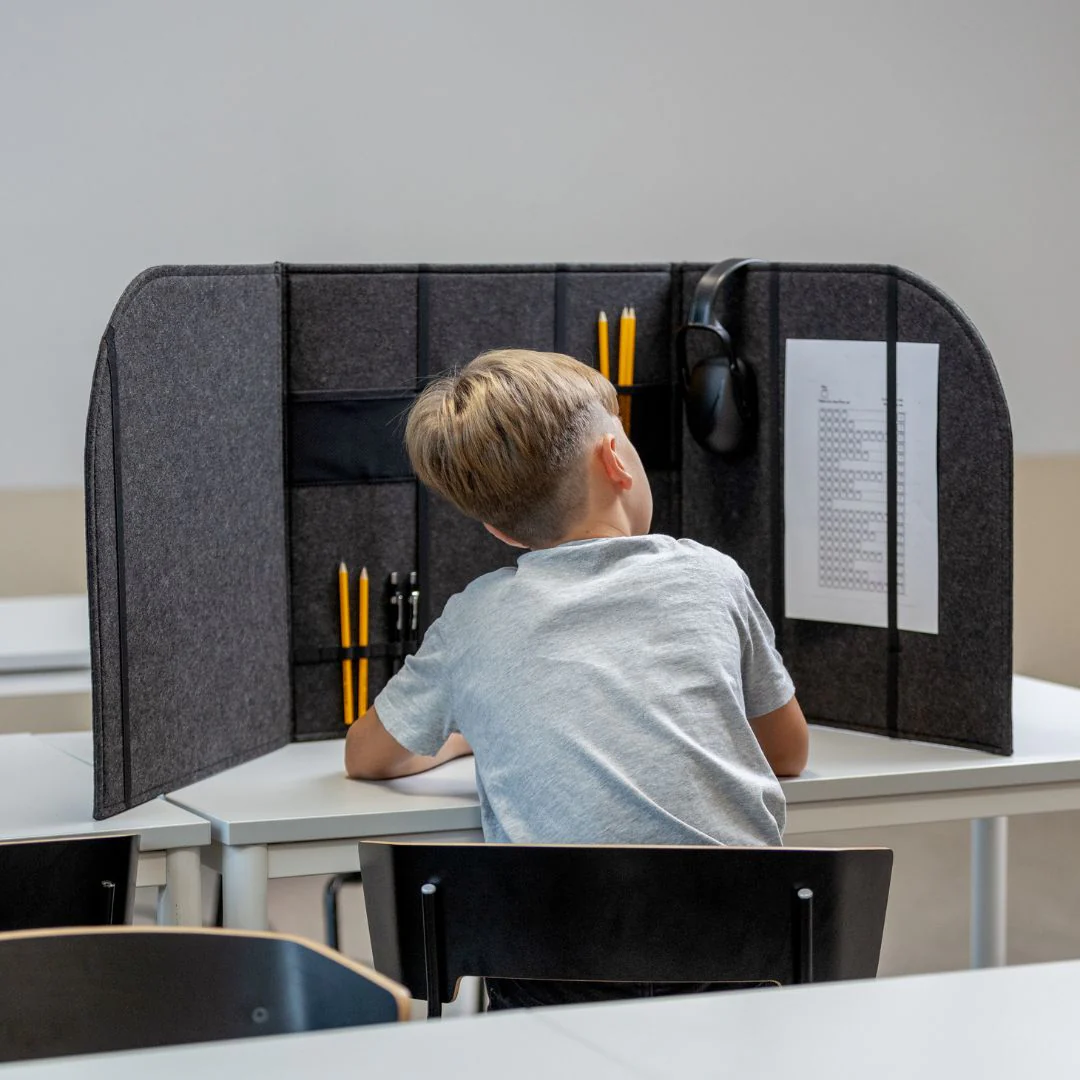 Skab et roligt og fokuseret miljø med den store lyddæmpende skrivebordsskærm. Uanset om det er derhjemme eller i klasseværelset, er denne skærm en smart løsning for børn, der har brug for at skærme sig fra distraktioner. Den er ikke kun praktisk til daglig brug, men også ideel under prøver, hvor pladsen kan være trang. Målene på 50 x 50 x 50 cm gør den nem at integrere i enhver indretning, mens dens innovative design giver mulighed for at klappe den sammen eller hænge den op, når den ikke er i brug. Den er fremstillet af 100 % genanvendt polyester, hvilket gør den til et bæredygtigt valg for både børn og miljøet. Skivebordsskærmen tilbyder også praktisk opbevaring til papirer, kuglepenne, blyanter og andre småsager, hvilket hjælper med at holde arbejdsområdet organiseret. Den understøtter relevante kompetencer, der er vigtige for dit barns trivsel og evne til at lære. Den inviterer dit barn til at fordybe sig og tilbyder en perfekt ramme for koncentration og afslapning. Velegnet til børn fra 5 år og op, er denne lyddæmpende skrivebordsskærm en uundgåelig tilføjelse til ethvert studieområde.