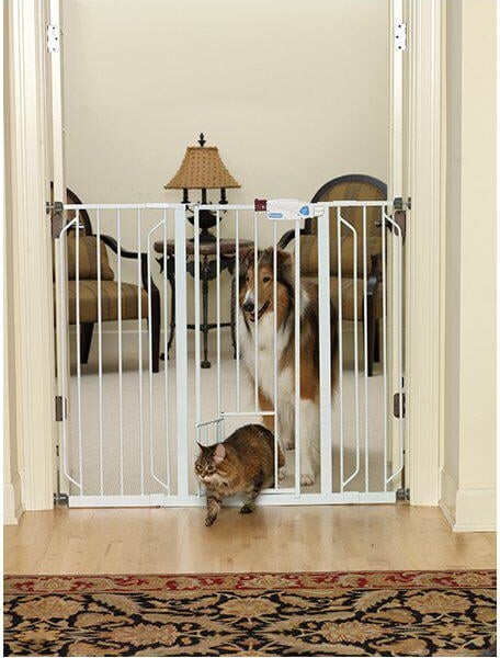 Med en justerbar størrelse fra 81x76 cm til 112 cm, passer dette hundegitter til de fleste døråbninger og trapper. Det høje design sikrer, at selv de mest nysgerrige hunde ikke kan hoppe over det. Gitterets praktiske walk-thru funktion gør det nemt for dig at passere, uden at du behøver at tage gitteret ned.