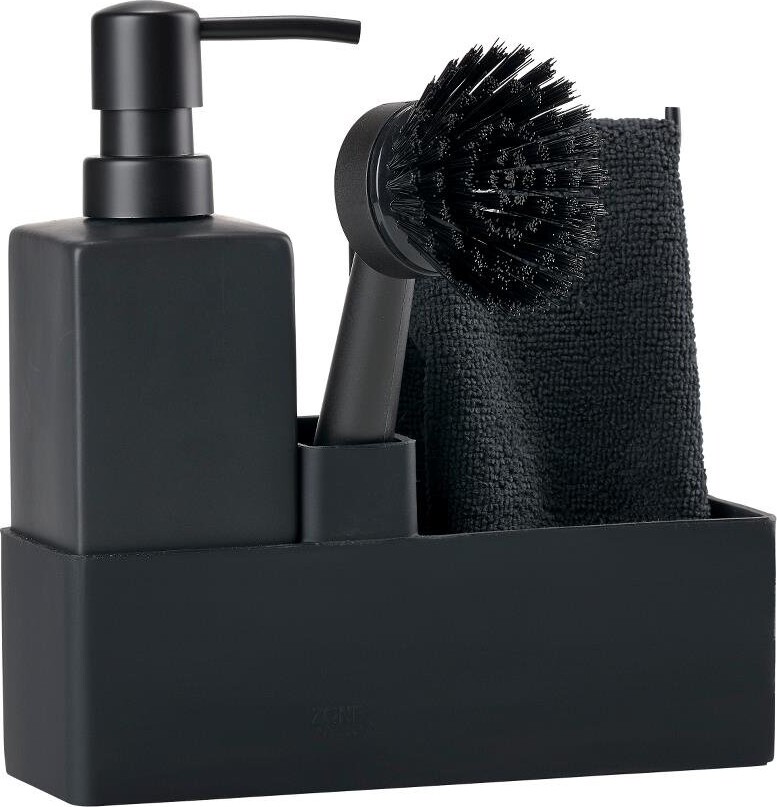 Zone Opvaskesæt - Sæbedispenser, Opvaskebørste Og Køkkenklud I Holder - Sort