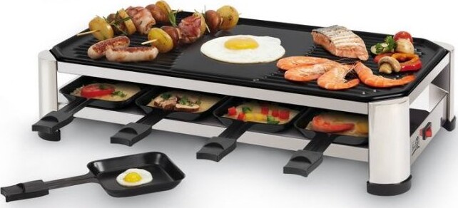 Den smarte design gør det muligt at grille og smelte ost på samme tid, hvilket er perfekt til en klassisk raclette-aften. De medfølgende små pander gør det nemt at tilberede individuelle portioner, så alle kan nyde deres yndlingsretter.