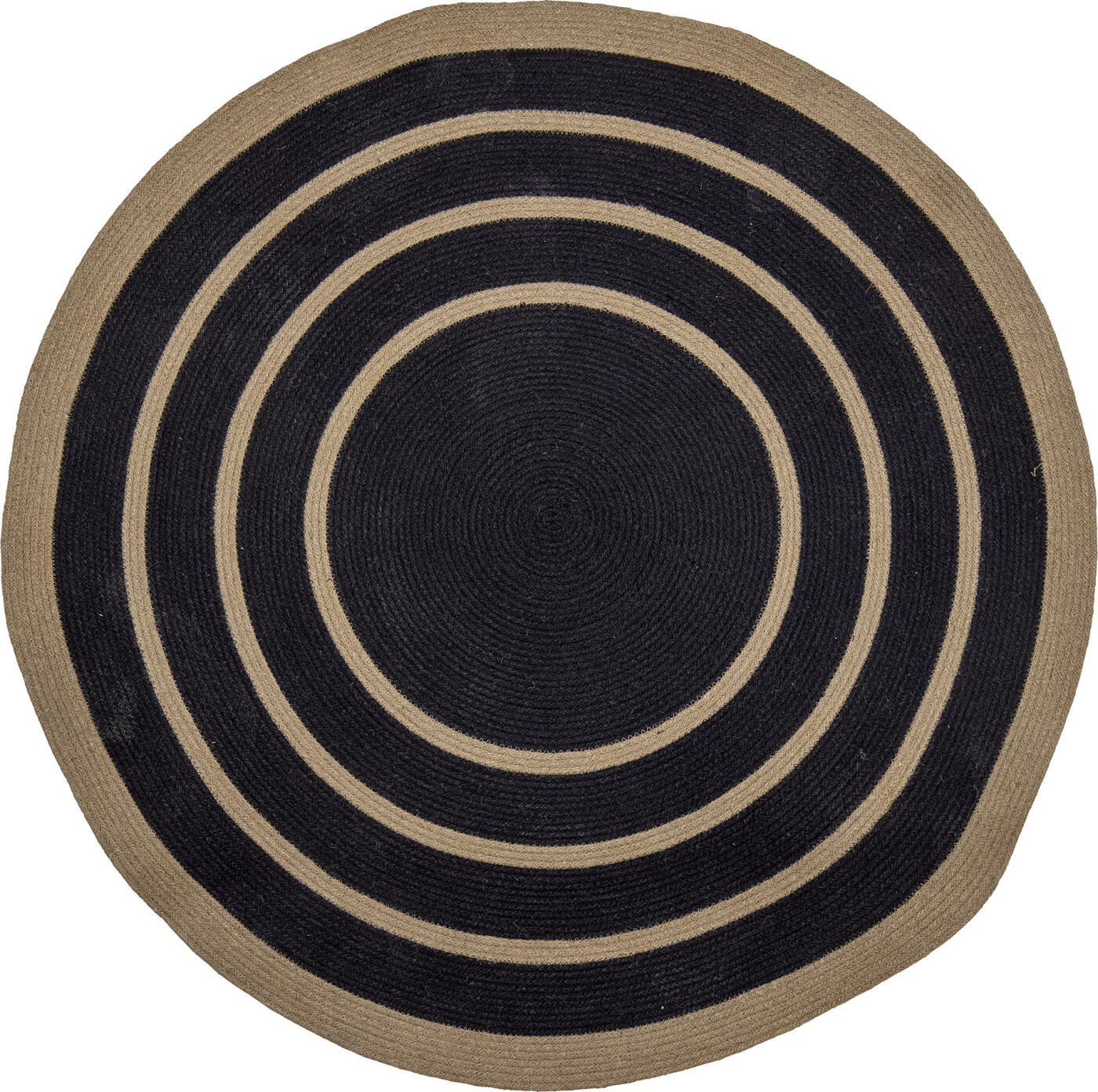 Lune-tæppet fra Bloomingville er lavet af 100% jute vævet i en rund form med sorte striber....
