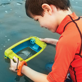 Hvad findes der under vandoverfladen? Find ud af det med denne båd med indbygget forstørrelsesglas!Perfekt til ture til søen eller kysten eller til sjov leg i swimmingpoolen eller badekarret.Båden har en gennemsigtig bund med forstørrelseseffekt, der gør det muligt for dit barn at se under overfladen. Fantastisk til opdagelse og udforskning. Der er endda plads til en lille figur eller to i båden.I båden er der en line med en redningskrans på, som dit barn kan have om håndleddet. Så forsvinder båden ikke så nemt, hvis den skal ud på eventyr på det åbne hav. Et must-have til ferien.Tag den med på stranden og se, hvad der befinder sig under havets overflade af levende små skabninger. Helt nødvendigt udstyr til den lille havbiolog.Båden måler ca. 25 x 13 x 7 cm.Alder: Fra 3-8 år.