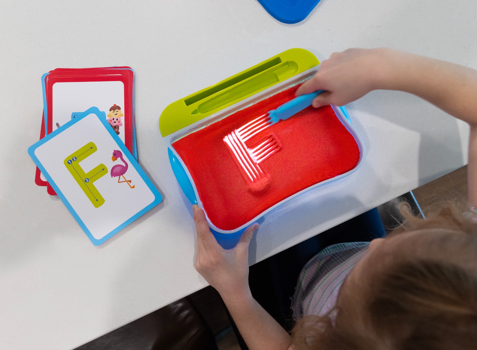 Vælg et kort og lad dit barn bruge pennen til at genskabe tallet eller bogstavet i det røde legesand. Pennen har både en skriveende og en rive i den anden ende, så dit barn kan lave fine mønstre i sandet. Det hele foregår på en LED-lysboks, der lyser med 2 AAA-batterier (som ikke medfølger). 340 gram legesand.18 kort med tal og bogstaver på begge sider.