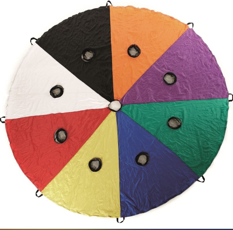Letvægtsaldskærm, der er nem at putte i en rygsæk og tage med på tur. I faldskærmen er der også huller med net i, så I kan kaste til måls med fx ærteposer.