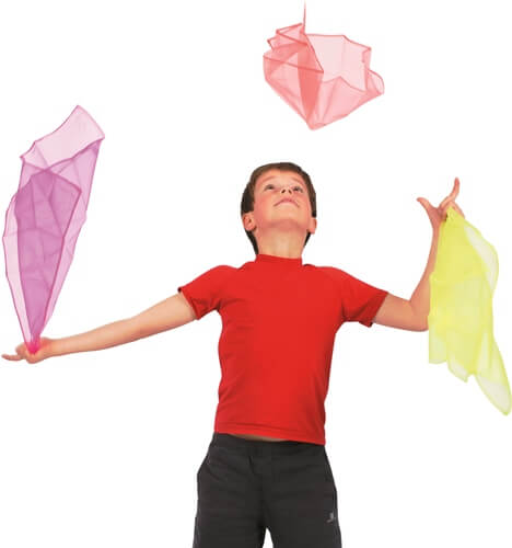 Tørklæder er det nemmeste objekt visuelt at fange og følge. Tørklæderne er perfekte til at lære at gribe, kaste og måske jonglere med. De styrker evnen til at følge et objekt og gribe, øger motorikken og den generelle styrke i kroppen. En inspirationsguide følger med.