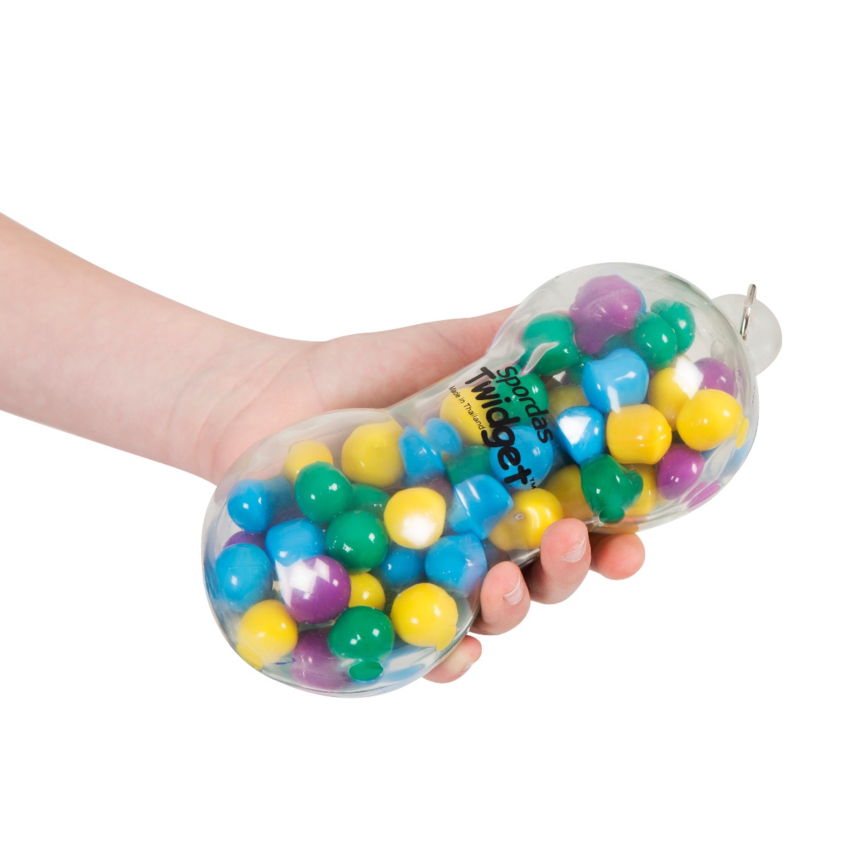 Når børn leger med denne særlige bold med kuglefyld giver det ro i kroppen, træner fokus og koncentration, finmotorik, stimulerer sanserne og kan også styrke koordinationen af højre/venstre side af kroppen samt muskelstyrke i hænder og fingre. Lyden i bolden øger opmærksomheden og træner den rytmiske sans. Dimsebolden har en nøglering, så den kan sættes fast på en barnetaske eller lignende og dermed være tilgængelig præcis på det rigtige tidspunkt. Bolden er lavet af latex-frit vinyl, som er meget stabilt, og indholdet er af silicone. Dimsebolden er særlig god til børn med autismespektrumforstyrrelser.Måler 16 cm på langs.