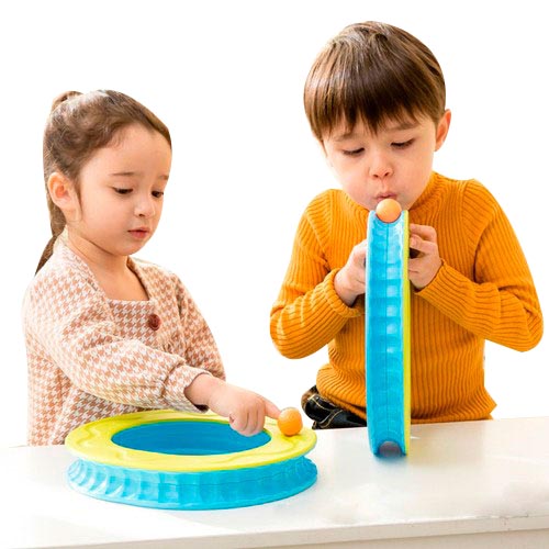 Et super redskab til at stimulere både finmotorikmotorik, balance og mundmotorik.Bolden skal nemlig føres igennem nogle forskellige baner, som giver udfordringer til lige præcis de nævnte grupper.1. Den limegrønne bane er S-formet og dit barn skal holde bolden på banen, men stadig have den til at køre rundt i samme hastighed. Kører den for langsomt triller den af eller går i stå., kører den for hurtigt triller den ligeledes af. Ved at følge bolden rundt på banen stimuleres øjemotorik og koncentration. 2 Den lyseblå bane er udstyret med lidt forhindringer, som gør at dit barn skal have fart på bolden for at få den over, men dog ikke for meget fart. Når dit barn skal holde bolden på det givne spor stimulerer det hånd/øje koordination samt stabilitet i hænderne. 3. Banen på ydersiden af ringen, bruges til at dit barn puster bolden rundt i banen, som i den grad stimulerer mundmotorikken.4. Banen på indersiden bruges ligeledes til at få kuglen til at centrifugere således at den holder sig på banen, selvom den faktisk bevæger sig lodret op.Denne balancecirkel kan bruges fra 3 år, men er god for mange aldre, der skal man se på det enkelte barn og vurdere de udfordringer, der er.Mål på den ovale cirkel: 28 x 25 x 4,5 cm (LBH) Bliver leveret med 2 bolde