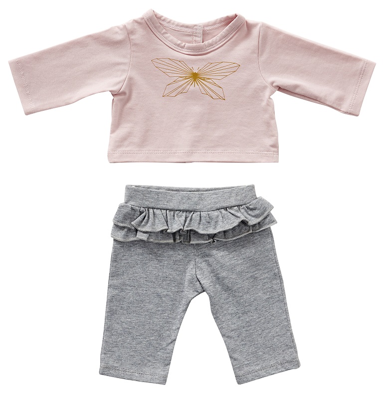 Meget charmerende sæt tøj til dukker fra 30 cm og op. Vælg den rigtige størrelse i menuen ovenfor. Blusen har en yndig sommerfugl i guld foran og lukkes med velcro bagpå. Bukserne har elastik i taljen og en fin flæse. Skal dukken have noget ekstra lækkert tøj og tilbehør, som er helt ligesom udstyr til rigtige menneskebabyer, så er de fine sæt fra By Astrup lige sagen.Tøjet og udstyret er fint forarbejdet af gode materialer.