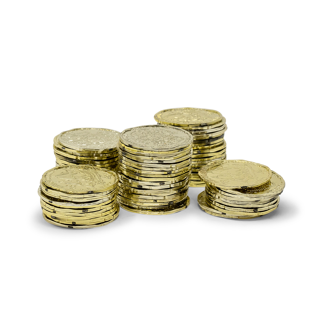 Fyld guldmønter i skattekisten. Det ser overdådigt ud, da der er hele 72 guldmønter i pakken.De kan bruges til skattejagt, guldgraverlege, tællelege, købsmandslege og hvad dit barn ellers kan finde på.Mønterne er fremstillet i plastik, og har en diameter på 3,5 cm.De kan rengøres med en fugtig klud eller med sprit.