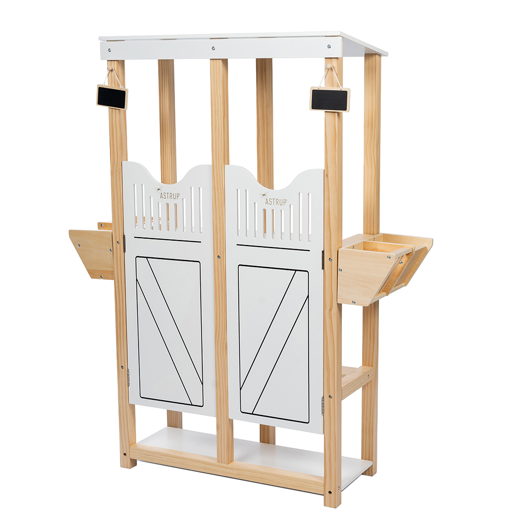 104,1 cm høj hestestald der er bred nok (84,1 cm) til at du kan have to kæpheste eller en enkelt kæphest og så dens tilbehør af grimer, strigetaske m.m. (hvis dit barn har det) hængende ved siden af. Tilpasset i højden til byASTRUPkæste med en pind på 40 cm og en cirkahøjde på 71 cm. Det kan give dig et fingerpeg, hvis dit barn har en anden kæphest end én fra byASTRUP. Med tag påLåger der kan åbnes så kæphestene stadig er nemme at tage udKridttavler så hestene kan få deres navne på hestestaldenFodertrug gør at maden er lige til at nå.Obs: Kæpheste følger ikke med.En dejlig gave til kæphesteglade unger og ikke mindst deres kæphest.Af robust fyrretræ/krydsfiner.