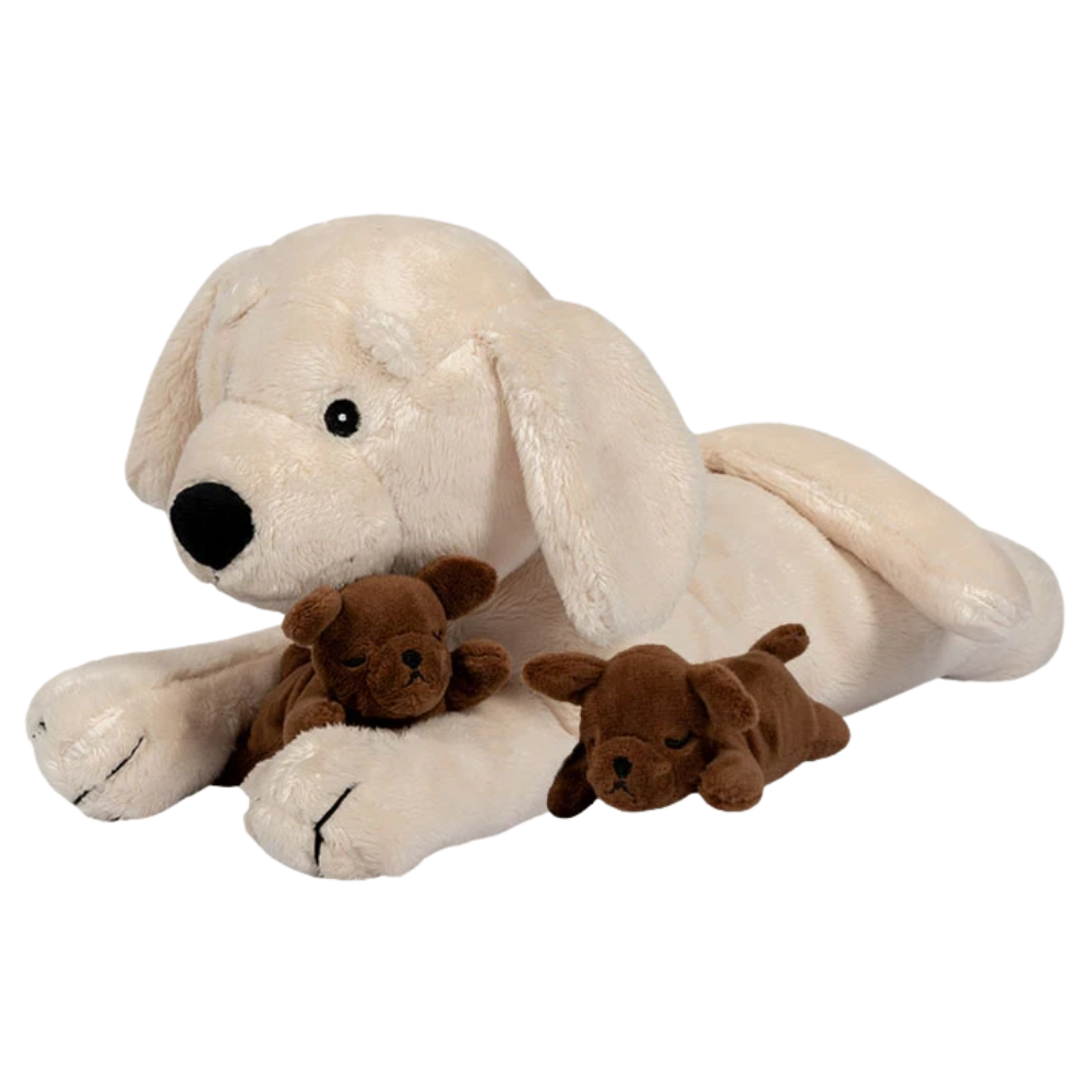 Kær og omsorgsfuld lys vovse med to chokoladefarvede hvalpe.Maven har en lille åbning med velcrolukning med plads til én af hvalpene.Størrelse på hund:37 cm (L) × 13 cm (B) × 17 cm (H)Størrelse på hvalpe:11 cm (L) × 6 cm (B) × 4,5 cm (H)Af polyester.